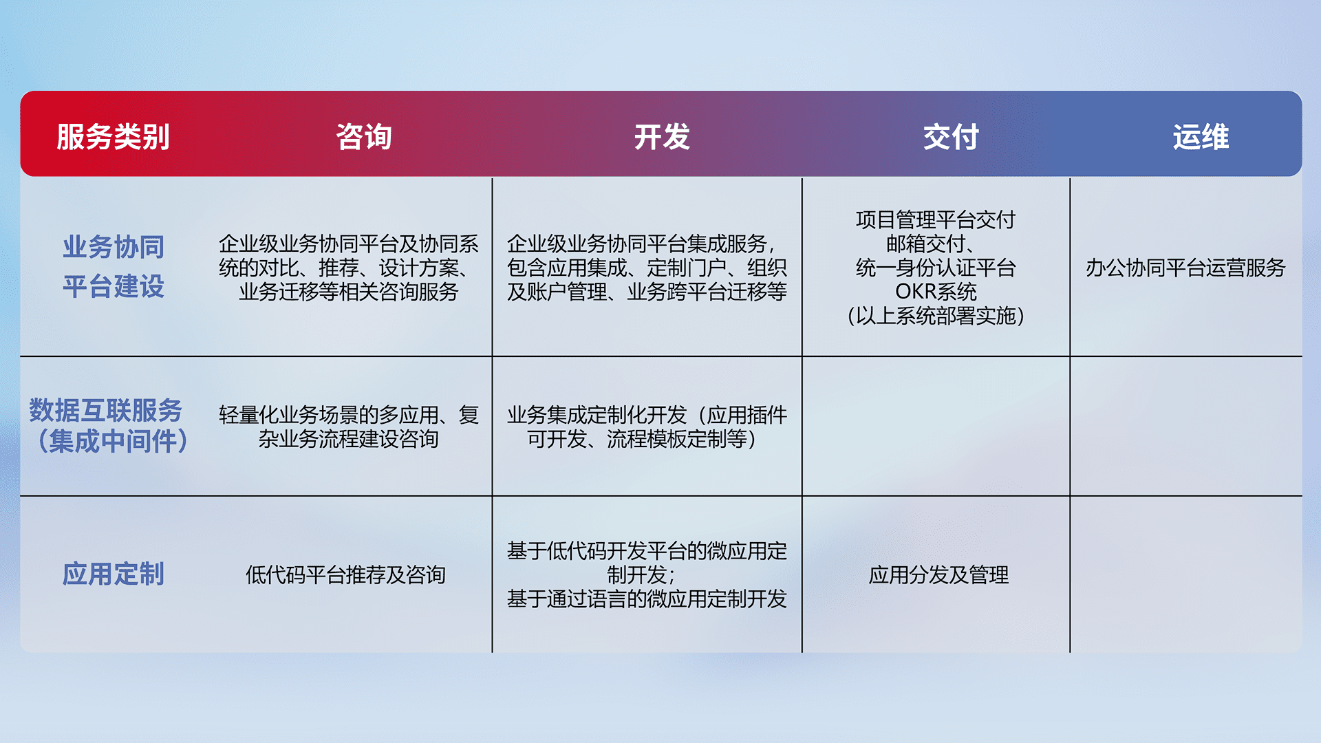 针对钉钉、、企微、、IDaas等平台级产品提供产品的规划、、、、方案、、交付、、定制化开发等服务,,,,实现如统一协同办公、、、智能客户服务、、、、混合会议管理、、、智能数据查询、、、等业务场景,,,实现数字化转型。。。。